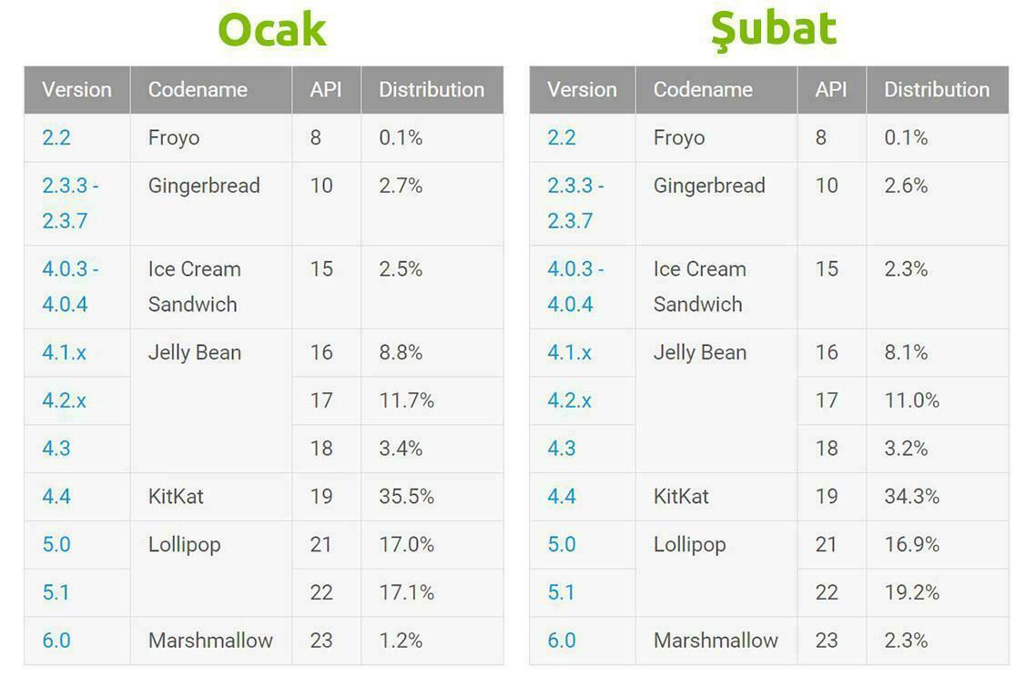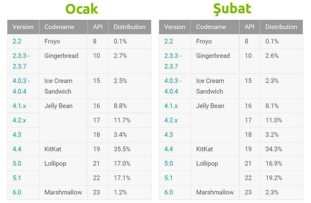 Şubat ayı Android sürümlerinin kullanım oranlarına göre Gingerbread, Ice Cream Sandwich, Jelly Bean ve Kitkat sürümleri düşüşe devam ederken Lollipop ve Marshmallow sürümlerinin yükselişine devam ettiğini görüyoruz.